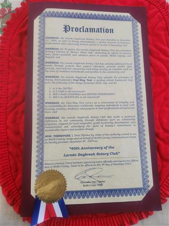 The Laredo Daybreak Rotary Club members celebrated their 40th Anniversary with a Proclamation held at the Webb County Courthouse on Monday, December 9, 2024.